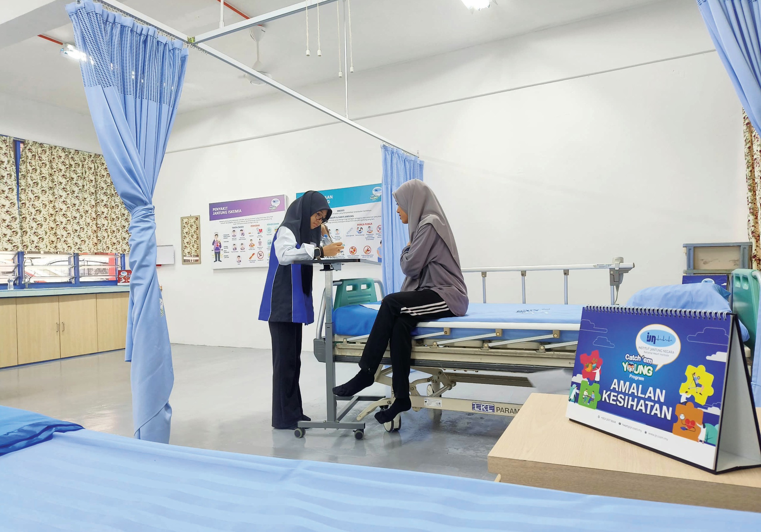 KANGAR: Suasana di bilik rawatan di Sekolah Menengah Kebangsaan (SMK) Derma seperti berada di wad hospital sebenar dengan kelengkapan katil yang selesa dan persekitaran menarik yang dihiasi mural berkaitan profesion kesihatan.