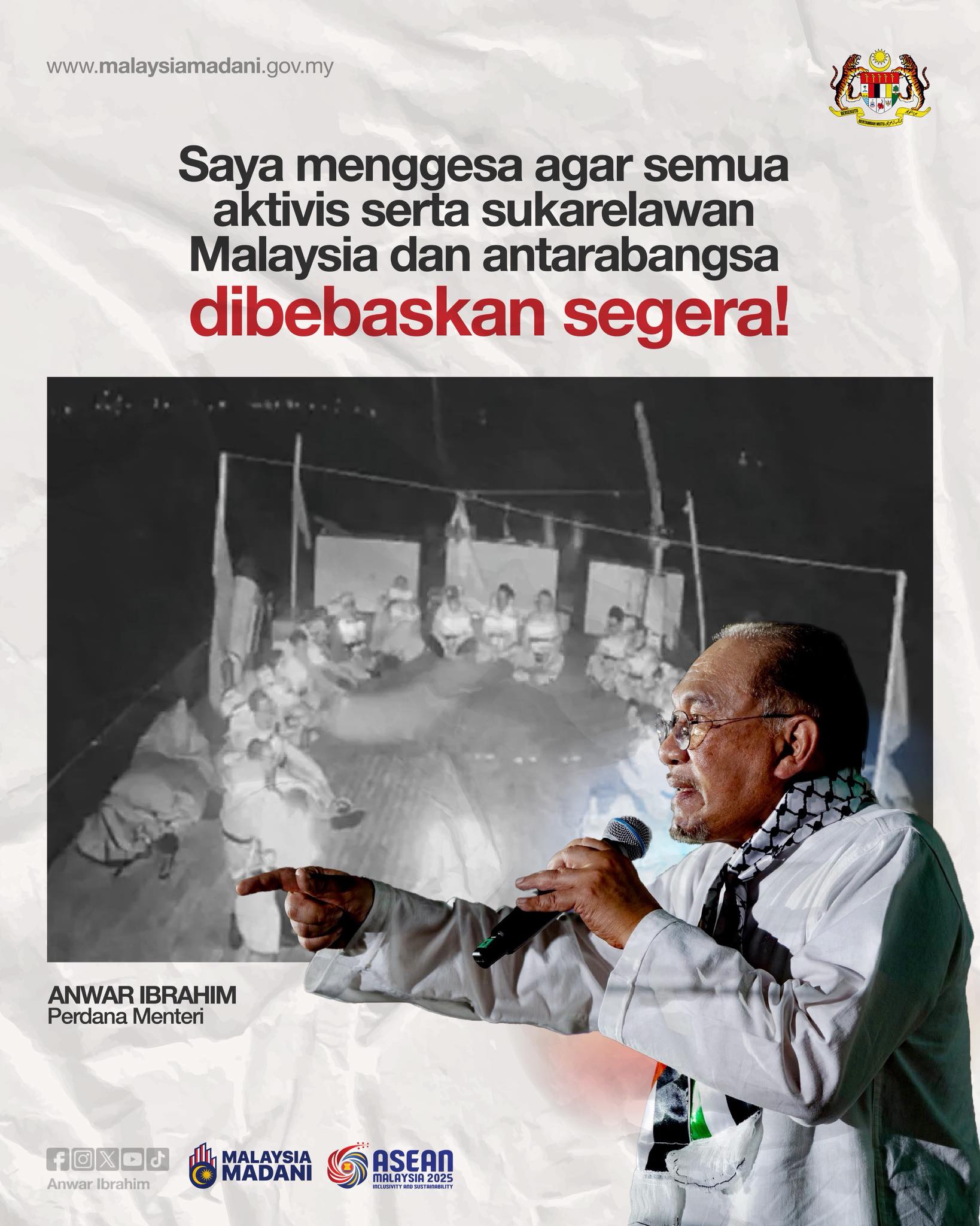 PETALING JAYA: Datuk Seri Anwar Ibrahim mendesak semua peserta Global Sumud Flotilla (GSF) termasuk rakyat Malaysia dibebaskan segera. Perdana Menteri juga menggesa pihak terlibat tidak bertindak kejam dan zalim kepada aktivis serta sukarelawan Malaysia dan antarabangsa. “Bebaskan mereka segera! Jangan bertindak kejam dan zalim kepada aktivis serta sukarelawan Malaysia dan antarabangsa,” katanya dalam Facebook beliau. Setakat ini, seramai 12 sukarelawan Malaysia yang menyertai misi GSF ditahan tentera Israel, menurut Sumud…