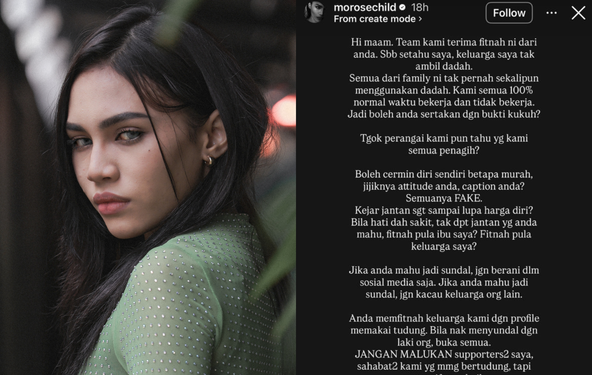 “Semua dari keluarga ini tak pernah sekalipun menggunakan dadah. Kami semua seratus peratus normal pada waktu bekerja dan tidak bekerja. Jadi, boleh anda sertakan dengan bukti kukuh?,” tulisnya di Instagram.