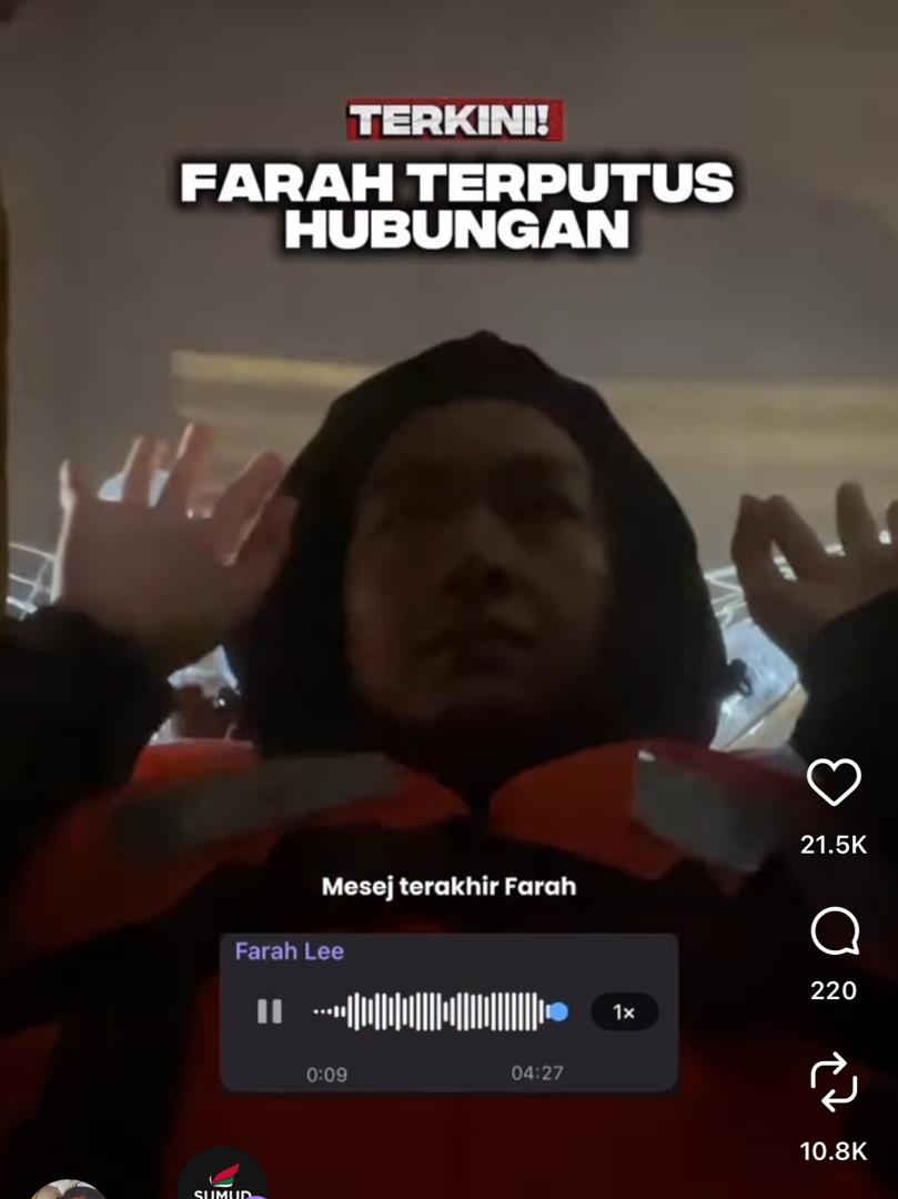 Itu pesanan mesej terakhir oleh seorang delegasi Malaysia, Nurfarahin Romli atau dikenali Farah Lee yang berada dalam kapal Kapal Grande Blu telah dipintas oleh rejim zionis di perairan antarabangsa pada pukul 12.58 pagi waktu Gaza.