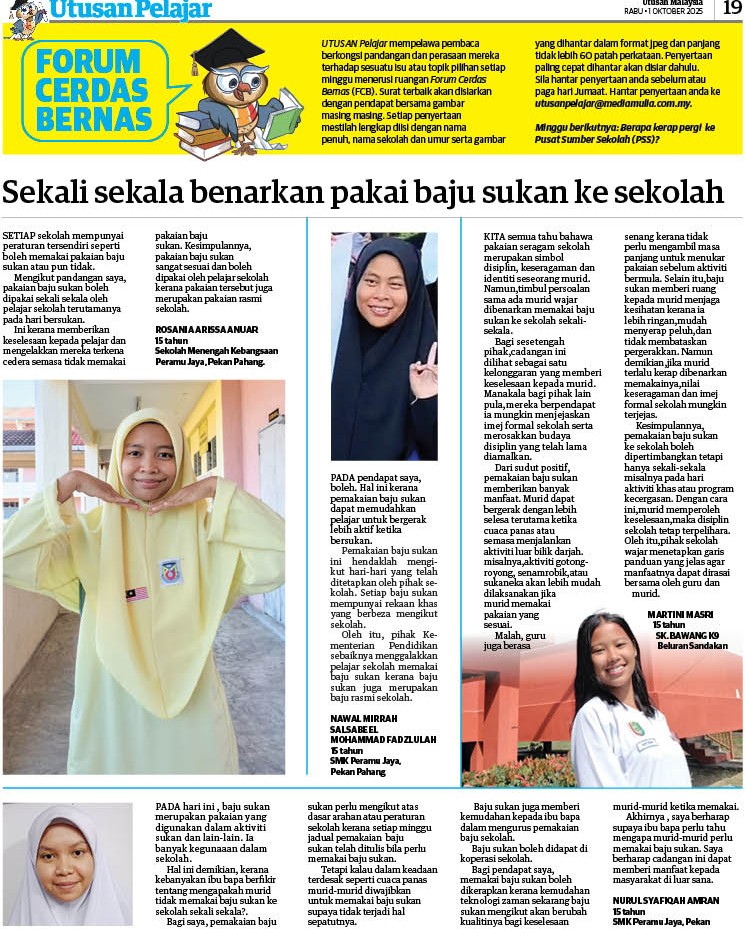 PETALING JAYA : Meski pun pakaian pelajar ke sekolah telah ditetapkan menggunakan seragam, tetapi mereka masih berharap ada masa tertentu dibenarkan memakai pakaian sukan.
