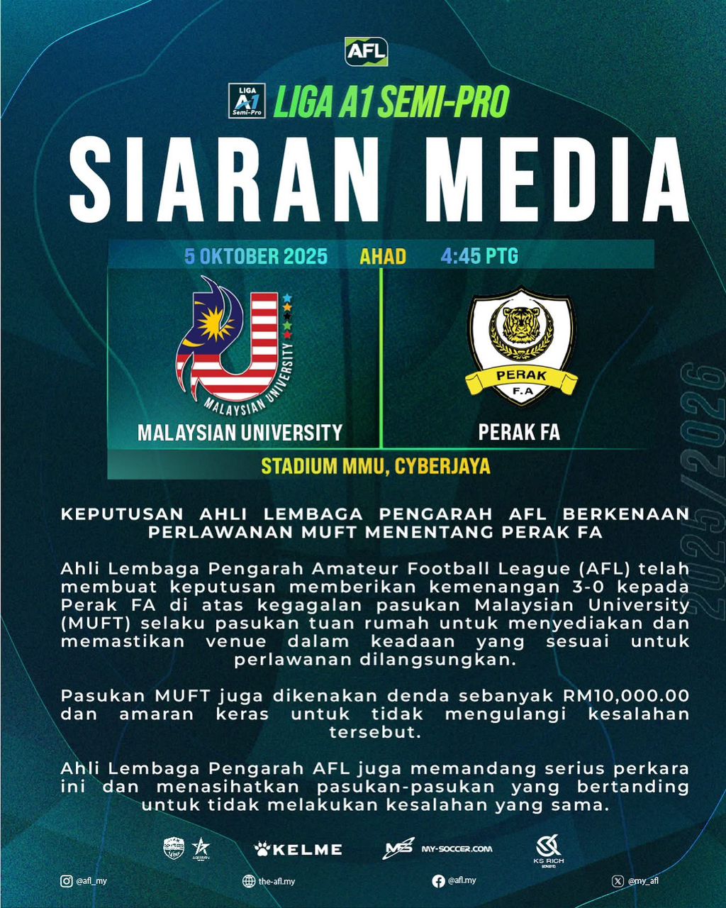 IPOH: Perak FA bersyukur apabila diberikan kemenangan 3-0 selepas pasukan lawan, Malaysian University (MUFT) gagal menyediakan padang untuk perlawanan Liga A1 Semi-Pro 2025-2026 di langsungkan Cyberjaya kelmarin.