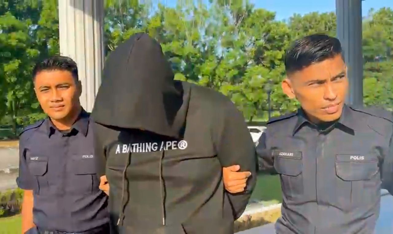 Suspek yang berusia 18 tahun sebelum itu tiba di pekarangan Kompleks Mahkamah Balik Pulau di sini kira-kira jam 8.15 pagi dengan diiringi anggota polis.
