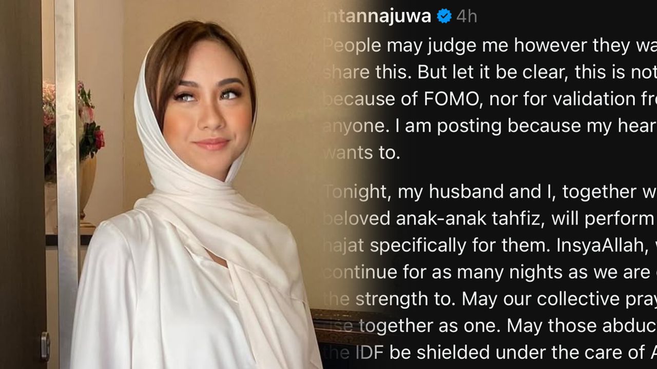 PETALING JAYA: Pelakon, Intan Najuwa, antara selebriti tanah air yang tidak henti mengikuti perkembangan terkini aktivis konvoi Global Sumud Flotilla (GSF) terutama ketika situasi tegang di perairan antarabangsa pada Khamis.