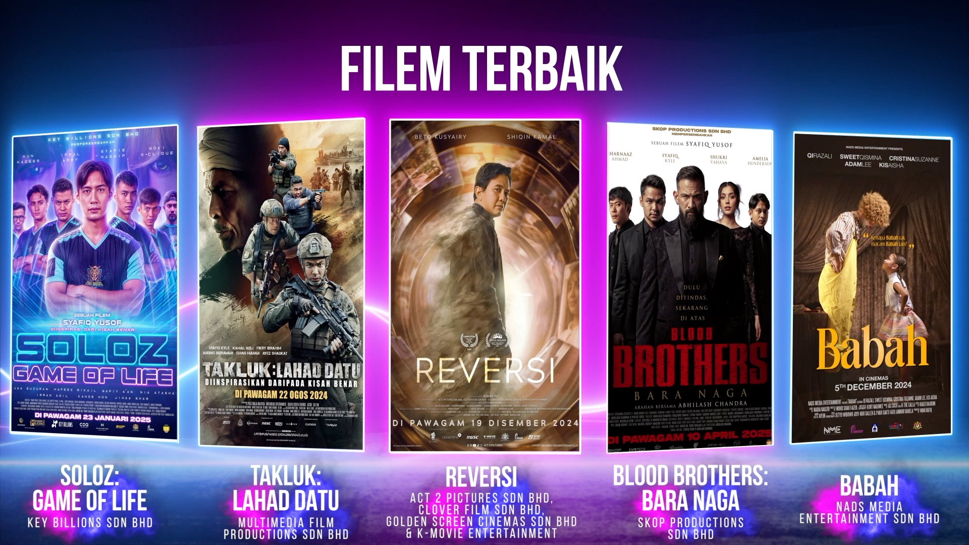 Bagi kategori Filem Terbaik tahun ini, lima naskhah disenarai pendek sebagai calon utama iaitu Blood Brothers: Bara Naga, Babah, Reversi, Takluk: Lahad Datu dan Soloz: Game of Life.