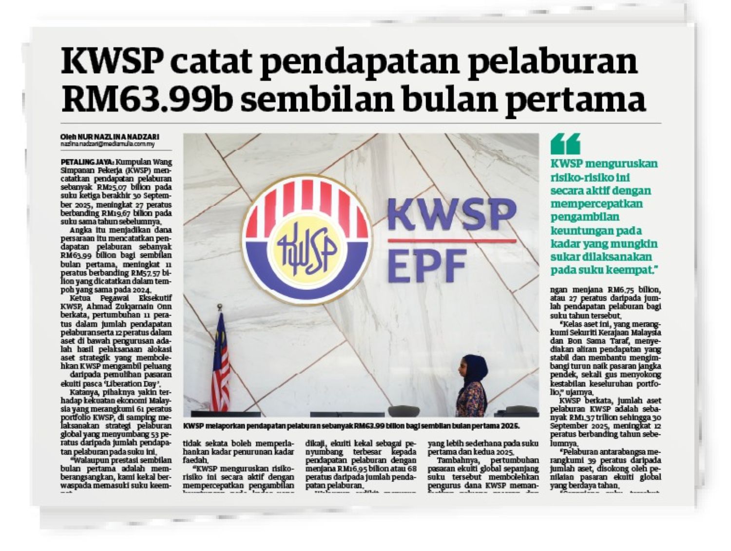 PETALING JAYA: Kumpulan Wang Simpanan Pekerja (KWSP) mampu mengagihkan dividen lebih tinggi sekitar 6.50 peratus jika terus mengekalkan prestasi positif hingga akhir tahun ini. Tahun lalu, KWSP mengumumkan dividen sebanyak 6.30 peratus bagi kedua-dua jenis simpanan, konvensional dan syariah, hasil daripada pendapatan pelaburan sebanyak RM74.46 bilion. Prestasi tahun ini dijangka lebih baik memandangkan setakat sembilan bulan tahun ini, KWSP telah merekodkan pendapatan pelaburan sebanyak RM63.99 bilion, lebih tinggi berbanding RM57.57…
