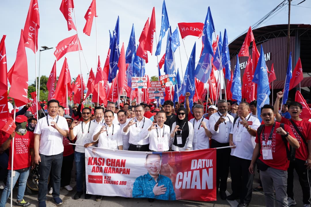 KOTA KINABALU: Penyokong parti kerajaan Perpaduan iaitu Pakatan Harapan (PH) dan Barisan Nasional (BN) mengiringi calon kerusi Dewan Undangan Negeri (DUN) Tanjung Aru, Datuk Datuk Chan Foong Hin. Kumpulan penyokong yang diketuai Setiausaha Agung DAP, Anthony Loke Siew Fook sambil membawa sepanduk ‘Kasi Chan ada harapan’ serta bendera PH dan BN dilihat mengiringi Foong Hin ke Dewan Sri Putatan dekat sini untuk proses penamaan. PH mempertaruhkan Foong Hin yang juga…