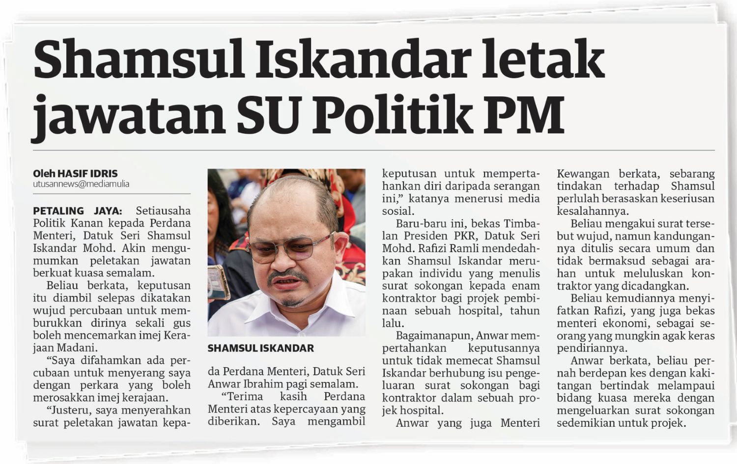 PETALING JAYA: Bekas Setiausaha Politik Kanan kepada Perdana Menteri, Datuk Seri Shamsul Iskandar Mohd. Akin perlu membersihkan imej kerajaaan dan pucuk pimpinan yang terpalit ekoran dakwaan rasuah dan salah guna kuasa ke atas dirinya. Tindakan itu perlu supaya nama baik kerajaan, PKR dan kepemimpinan dapat dibersihkan dan tidak menjejaskan perjalanan kempen Pilihan Raya Negeri (PRN) Sabah yang sedang berlangsung. Ahli Parlimen Pasir Gudang, Hassan Abdul Karim berkata, Shamsul Iskandar tidak…