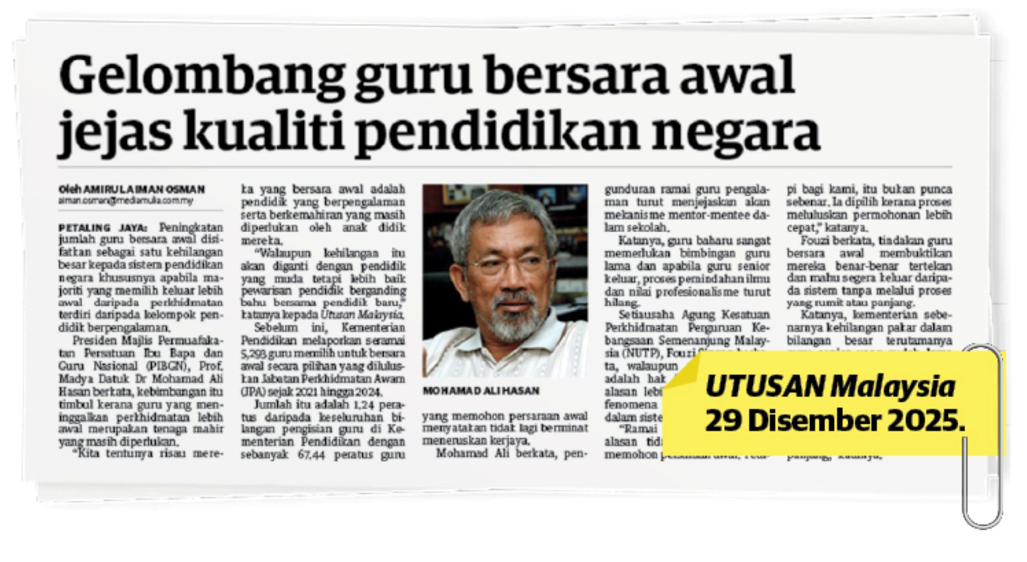 PETALING JAYA: Gelombang guru bersara awal tidak menjejaskan kualiti pendidikan negara sebaliknya, ia memberi peluang kepada lepasan pendidikan yang ramai dan masih menganggur untuk berkhidmat. Bekas Ketua Pengarah Pelajaran, Tan Sri Alimuddin Mohd. Dom berkata, selain itu, jumlah yang terlibat adalah kecil berbanding keseluruhan guru dan perkara itu memberi peluang kepada golongan graduan pendidikan yang masih menganggur untuk mula berkhidmat. Katanya, persaraan awal juga memberi peluang kepada guru muda untuk…