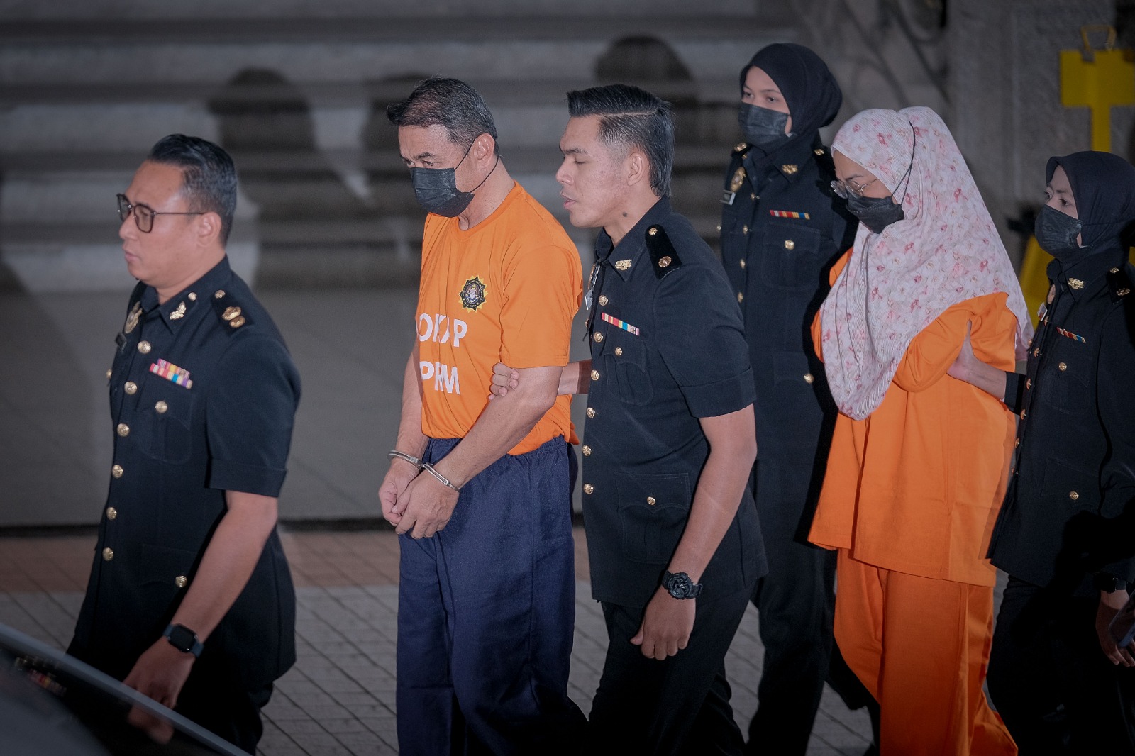 Bekas pegawai kanan tentera dan dua isterinya itu dilihat memakai baju tahanan lokap SPRM berwarna oren serta bergari. – UTUSAN