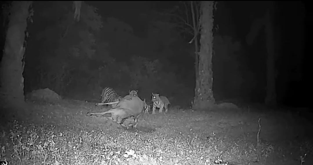 Terdahulu, tular video berdurasi 20 saat di media sosial yang memaparkan kehadiran empat ekor harimau termasuk dua bersaiz dewasa yang membaham seekor lembu. – UTUSAN