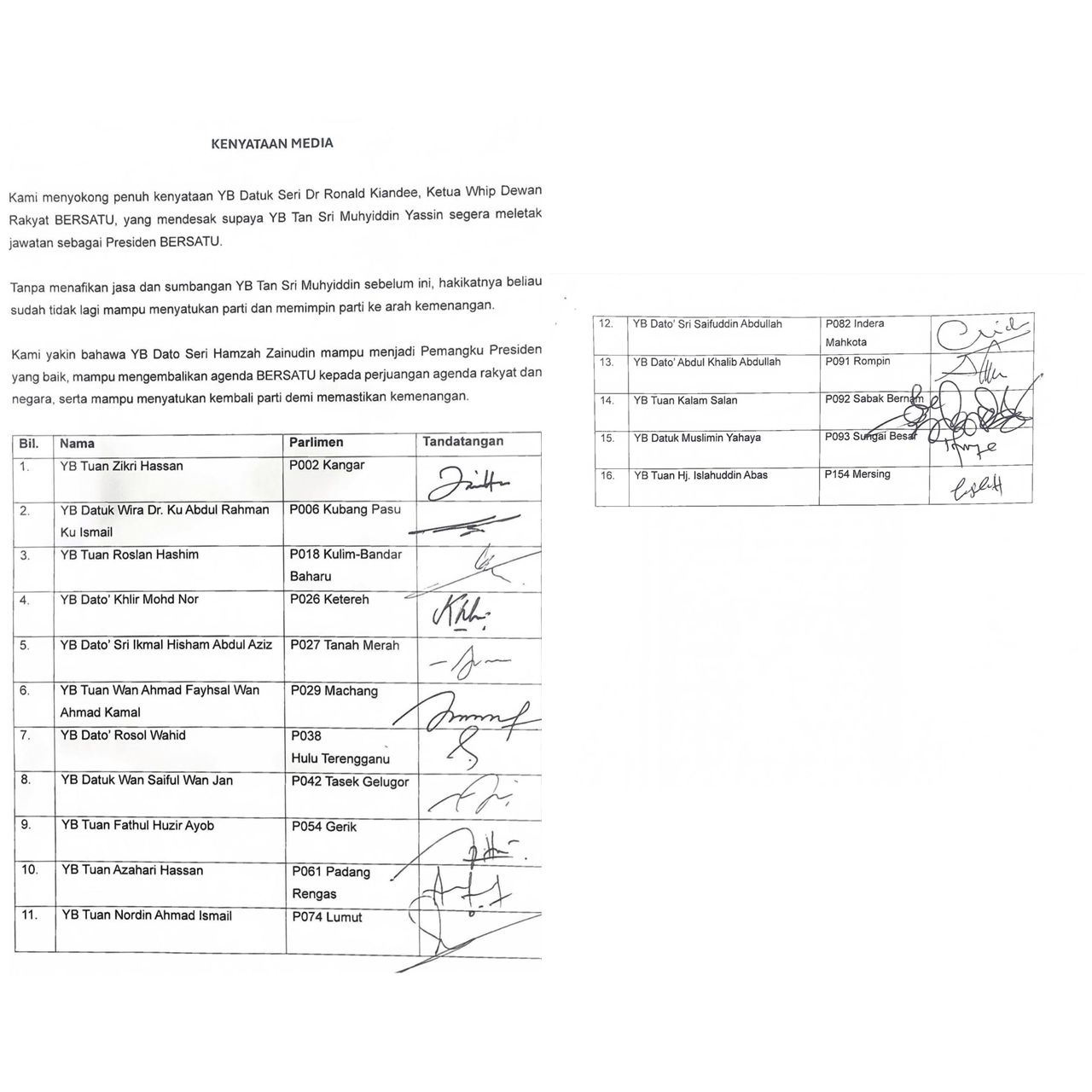 PETALING JAYA: 17 ahli Parlimen Parti Pribumi Bersatu Malaysia (Bersatu) mendesak Tan Sri Muhyiddin Yassin melepaskan jawatannya sebagai Presiden dan memberi ruang kepada Datuk Seri Hamzah Zainudin untuk mengemudi parti. Menerusi kenyataan bersama, wakil-wakil rakyat itu berkata, mereka menyokong penuh kenyataan Ketua Whip Dewan Rakyat Bersatu, Datuk Seri Dr Ronald Kiandee yang mendesak supaya Muhyiddin berundur kerana tidak lagi mempunyai keupayaan untuk menyatukan Bersatu dan membawa parti ke arah kejayaan.…