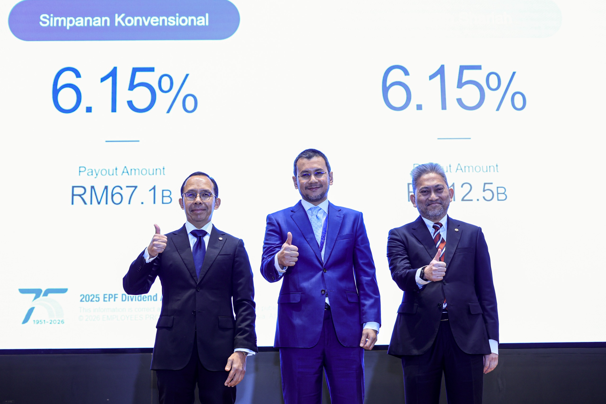 SUNGAI BULOH: Kumpulan Wang Simpanan Pekerja (KWSP) mengumumkan kadar dividen sebanyak 6.15 peratus untuk Simpanan Konvensional dan Simpanan Syariah bagi tahun berakhir 31 Disember 2025 dengan jumlah agihan adalah sebanyak RM79.6 bilion