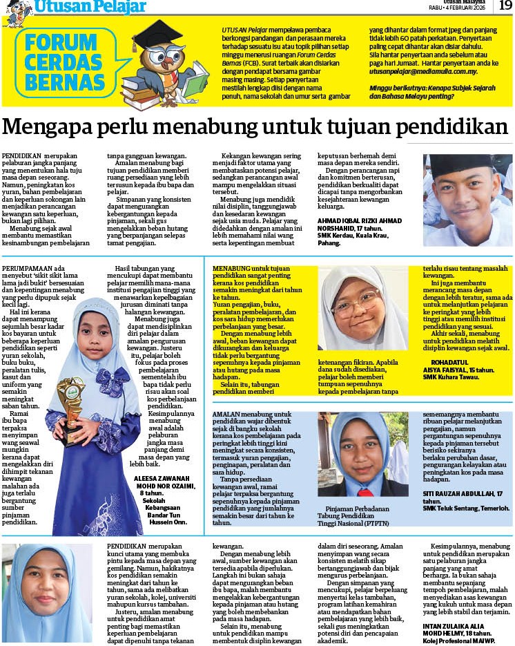 PETALING JAYA : Pelajar berpendapat perlunya ada inisiatif ibu bapa supaya membuat tabungan sebagai persiapan memasuki alam persekolahan atau mendaftar di institusi pengajian tinggi (IPT).