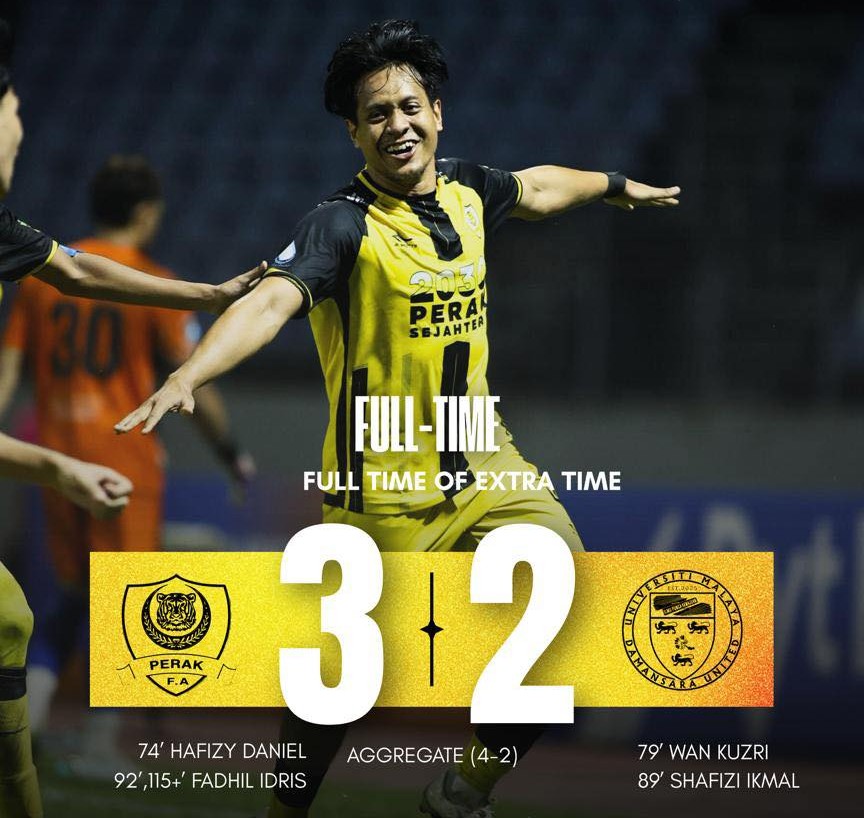 Aksi pada masa tambahan menyaksikan penguasaan Perak yang melenyapkan cabaran lawan dengan dua gol Fadhil untuk menempah tempat ke separuh akhir. – UTUSAN