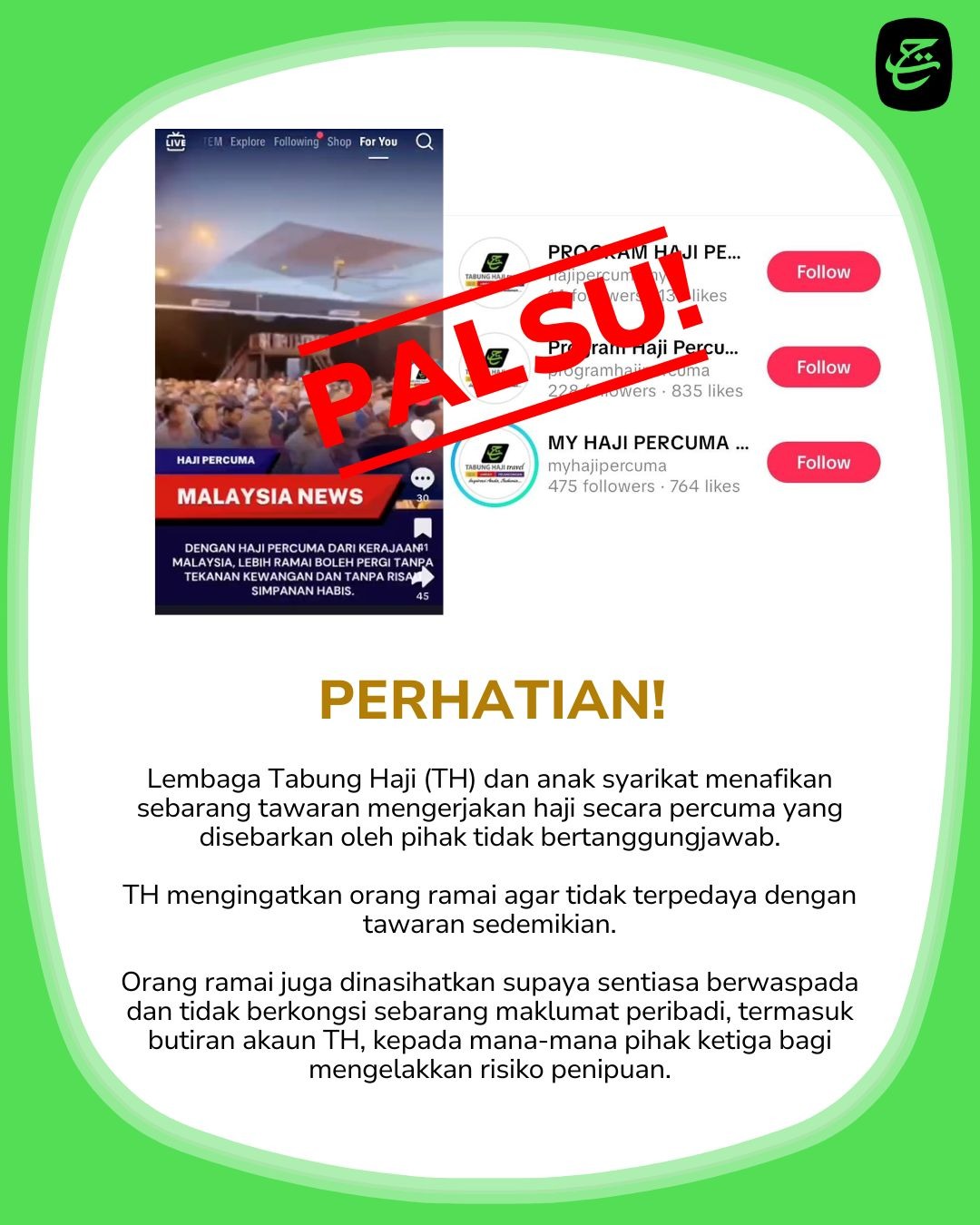 PETALING JAYA: Lembaga Tabung Haji (Tabung Haji) menafikan sebarang tawaran mengerjakan haji secara percuma sama ada secara langsung atau melalui anak syarikat yang disebarkan oleh pihak tidak bertanggungjawab dalam mana-mana platform media sosial. Tabung Haji memaklumkan, sebarang tawaran sedemikian adalah palsu dan bertujuan mengelirukan orang ramai. “TH telah mengesan kewujudan beberapa akaun media sosial yang membuat tawaran haji percuma. “Orang ramai dinasihatkan supaya sentiasa berwaspada dan tidak berkongsi sebarang maklumat…