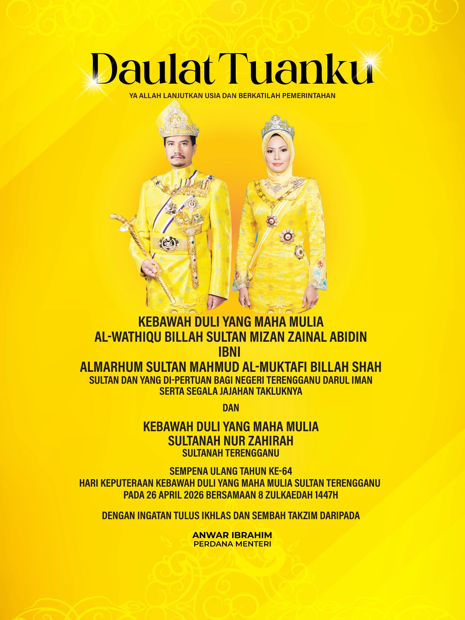 PETALING JAYA: Perdana Menteri, Datuk Seri Anwar Ibrahim merafak sembah ucapan tahniah sempena Sambutan Ulang Tahun Hari Keputeraan ke-64 Sultan Terengganu, Sultan Mizan Zainal Abidin. Beliau turut mendoakan agar Sultan Mizan dan Sultanah Terengganu, Sultanah Nur Zahirah serta seluruh kerabat diraja sentiasa dikurniakan kesejahteraan dan berada dalam lindungan rahmat Allah. “Patik mendoakan ke hadrat Allah Subhanahu Wa Ta’ala semoga Tuanku Sultan dan Sultanah serta seluruh kerabat diraja sentiasa dilimpahi rahmat…