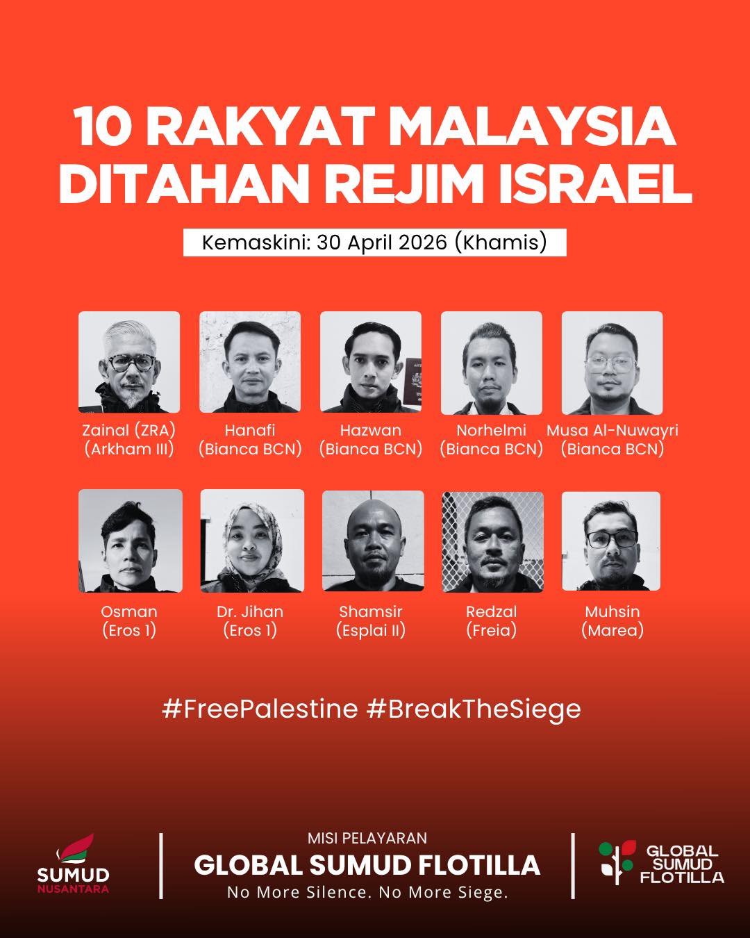 “SNCC turut mengesahkan bahawa seramai 175 orang aktivis telah diculik dan dibawa ke Israel menggunakan kapal laut milik rejim, termasuk 10 orang rakyat Malaysia yang turut berada dalam kumpulan tersebut,” katanya dalam kenyataan hari ini.