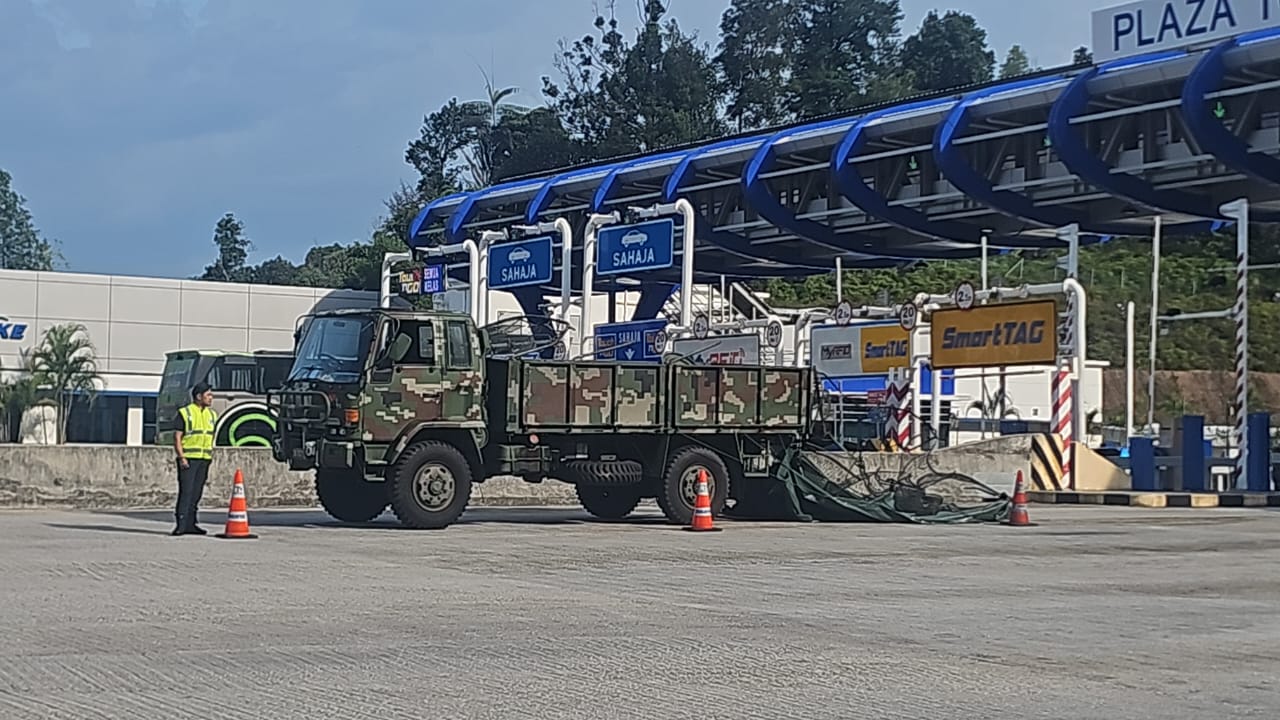 PETALLING JAYA: Seramai 13 anggota tentera cedera selepas trak membawa mereka merempuh palang Plaza Tol Teratai, Lebuhraya Bertingkat Sungai Besi-Ulu Kelang (SUKE) di Ampang dekat sini, petang ini.