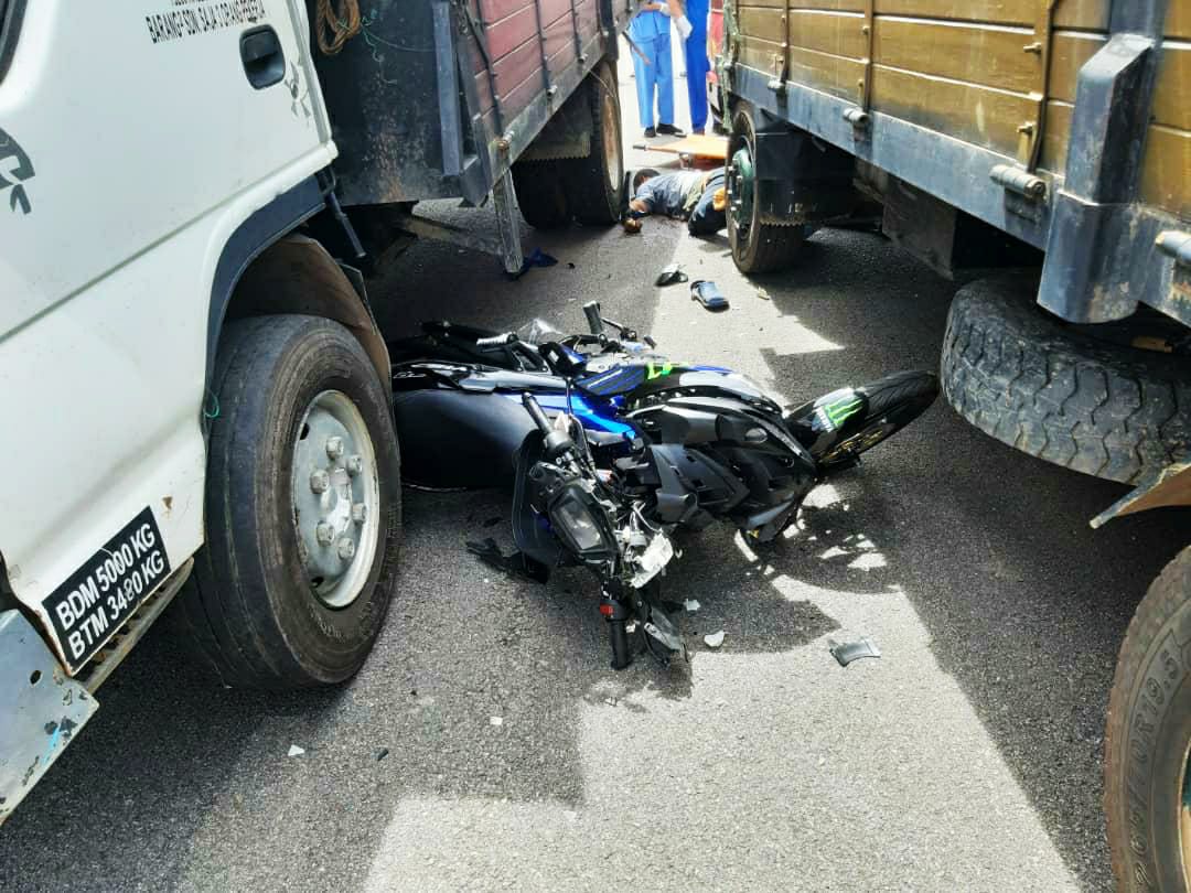 ALOR GAJAH: Seorang penunggang motosikal maut selepas cuba mencelah lalu di antara dua buah lori di Jalan Kampung Pegoh Dalam di sini, pagi tadi.