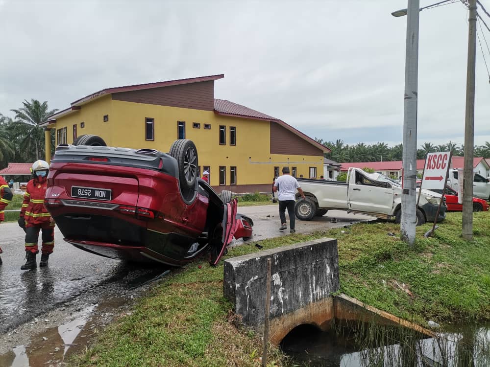 Kemalangan itu mengakibatkan SUV dinaiki keluarga berkenaan turut terbalik dipercayai akibat rempuhan kuat. -UTUSAN ONLINE