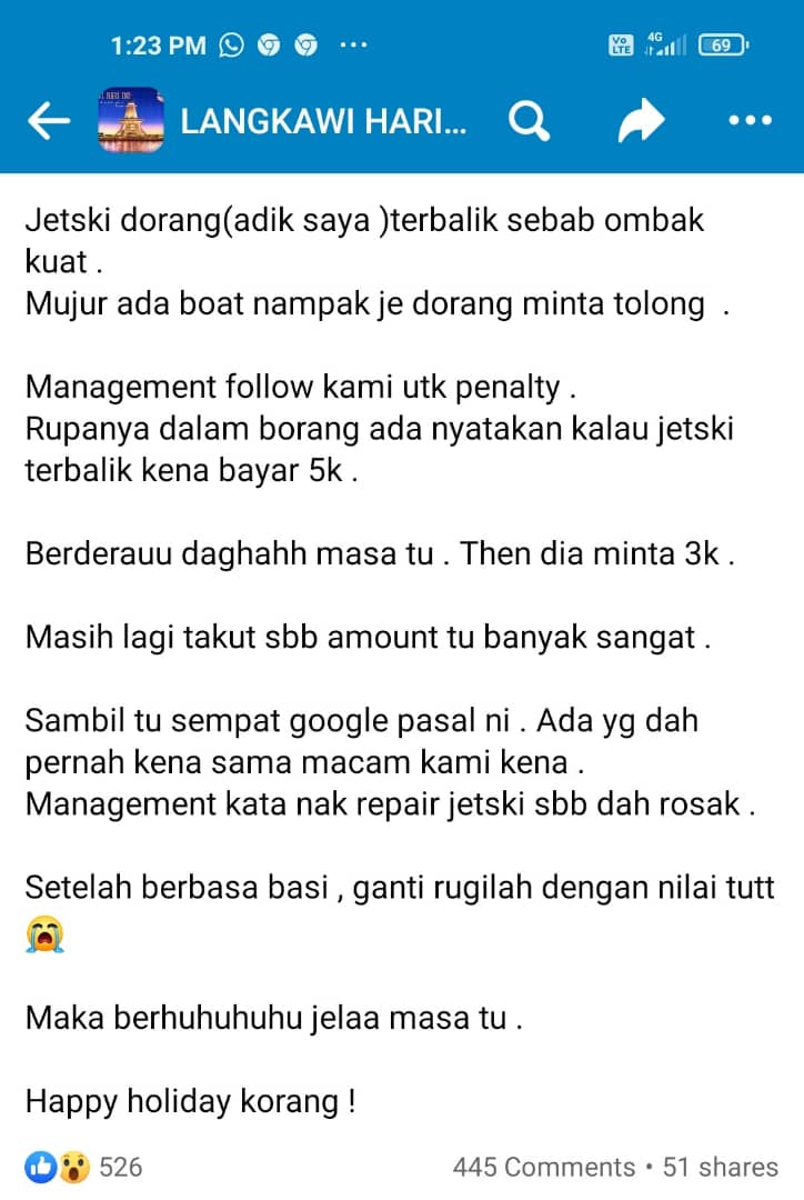 “Management follow kami utk penalty. Rupa-rupanya dalam borang ada nyatakan kalau jetski terbalik kena bayar 5k,” tulisnya.