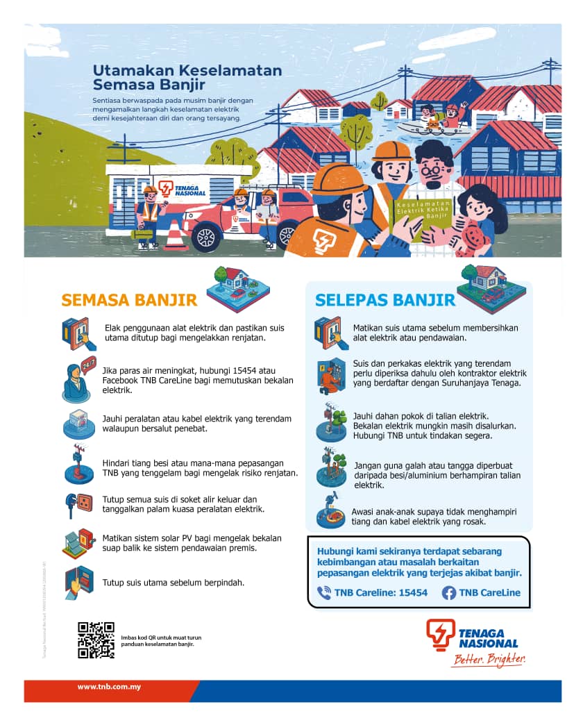 Tenaga Nasional Berhad (TNB) menasihatkan orang ramai berwaspada semasa musim banjir dan mengambil langkah keselamatan sewajarnya.