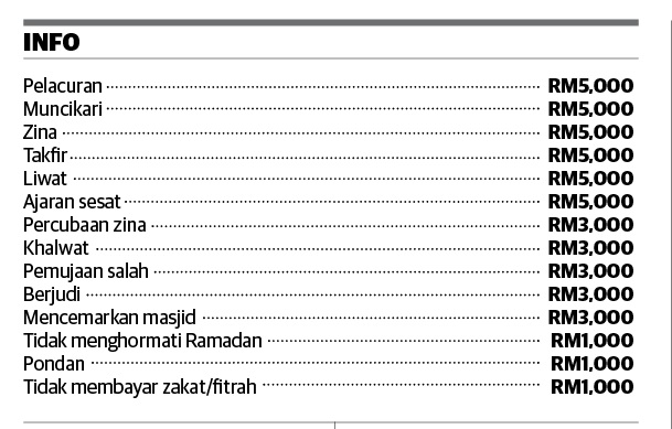 Begitulah yang tertera di bahagian info artikel ini senarai hukuman denda bagi sebahagian daripada 45 kesalahan jenayah syariah yang diperuntukkan menerusi Akta Kesalahan Jenayah Syariah (Wilayah-Wilayah Persekutuan) 1997 (Akta 559). Menyedihkan, kerana jumlah tersebut jelas lebih rendah berbanding harga sebuah telefon bimbit yang menjadi idaman muda-mudi seperti Iphone 15 Pro Max yang bernilai antara RM6,499 hingga RM8,499, Samsung Galaxy Z Fold5 (antara RM6,799 – RM7,299) serta Huawei Mate Xs (RM11,111).…