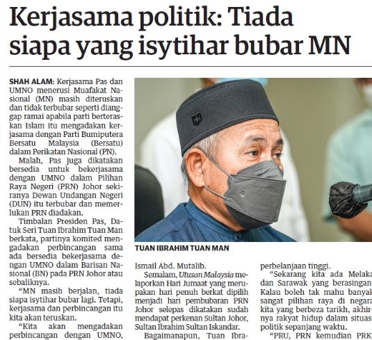 BERDASARKAN artikel akhbar Utusan Malaysia bertajuk Kerjasama politik: Tiada siapa yang isytihar bubar MN pada 22 Januari lalu, Timbalan Presiden Pas, Datuk Seri Tuan Ibrahim Tuan Man berkata, partinya komited mengadakan perbincangan sama ada bersedia bekerjasama dengan UMNO/Barisan Nasional (BN) pada Pilihan Raya Negeri (PRN) Johor atau sebaliknya.