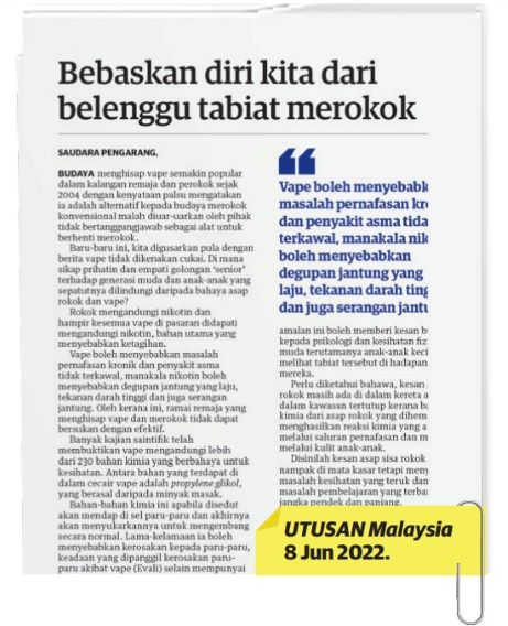 Semoga Malaysia akan menjadi negara bebas amalan merokok suatu hari nanti. Katakan tidak kepada asap rokok! – UTUSAN