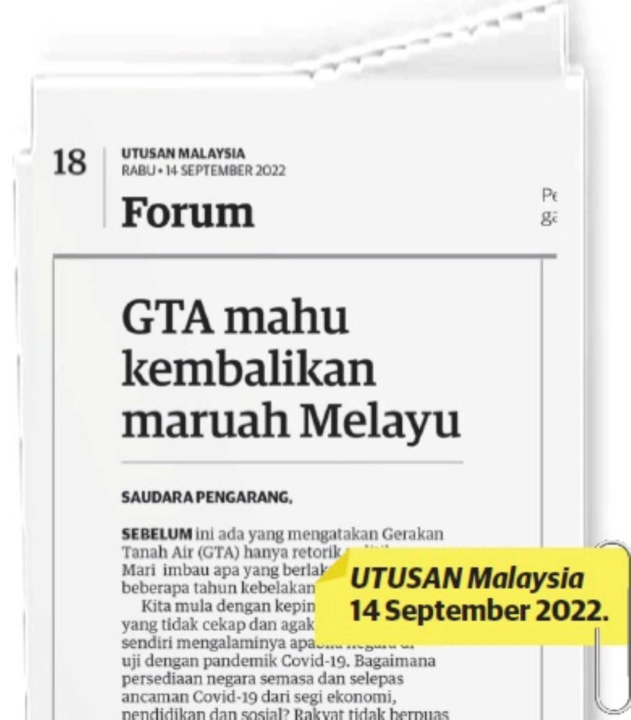 SEKALI lagi saya menyanggah kenyataan Ahli Majlis Eksekutif Pusat Parti Pejuang Tanah Air (Pejuang), Azman Mohd. Hashim yang diterbitkan Utusan Malaysia pada 14 September lalu bertajuk GTA mahu kembalikan maruah Melayu.