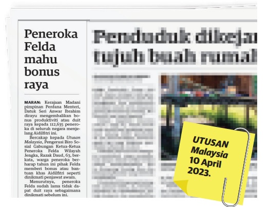 SEBELUM ini Utusan Malaysia menerbitkan artikel bertajuk Peneroka Felda mahu bonus raya pada 11 April lalu. Artikel berkenaan menyentuh harapan warga peneroka Felda yang mengharapkan bonus atau bantuan khas Hari Raya Aidilfitri seperti dinikmati penjawat awam.