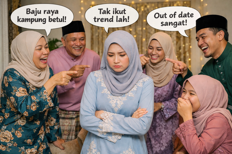 Tahun lepas, ada ahli keluarga bertanya, ‘Kenapa tak pakai baju raya ikut trend tahunan? Tiada duit ke nak beli? Walaupun mungkin hanya gurauan, kata-kata tu sangat menyakitkan hati dan merosakkan mood hari raya.