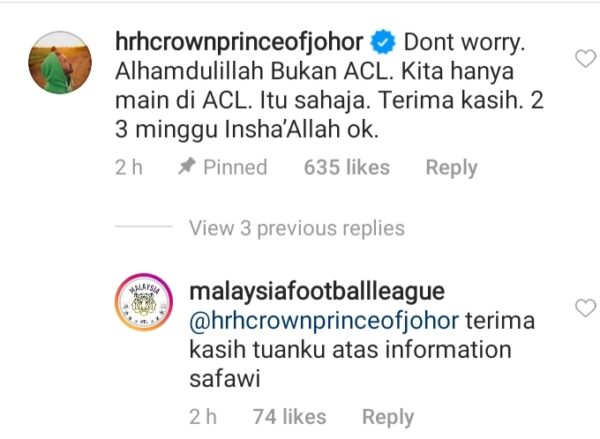 Tunku Mahkota Johor (TMJ) turut memberi jaminan pemain sayap yang berguru di Portugal itu sebelum ini akan kembali beraksi bersama pasukan dalam tempoh satu hingga dua minggu lagi.