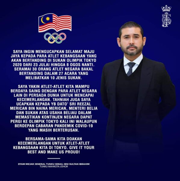 “Merafak sembah, menjunjung kasih dan setinggi-tinggi penghargaan atas perkenan Duli Yang Amat Mulia, Mejar Jeneral Tunku Ismail Ibni Sultan Ibrahim, Tunku Mahkota Johor @hrhcrownprinceofjohor menzahirkan kata-kata semangat kepada para atlet kebangsaan yang bakal bertanding dalam temasya Sukan Olimpik Tokyo 2020.