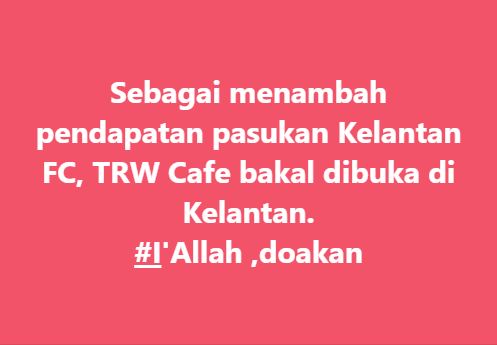 “Sebagai menambah pendapatan Kelantan FC, TRW Cafe bakal dibuka di Kelantan. Insya-Allah, doakan,” katanya yang turut mengesahkan bakal menerima pelabur baharu dengan nilai jutaan ringgit.
