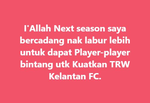 “Insya-Allah, musim depan saya bercadang nak labur lebih untuk dapat pemain-pemain bintang bagi menguatkan TRW (The Red Warriors) Kelantan FC.