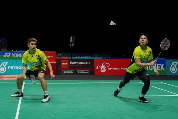 Sze Fei-Nur Izzuddin yang turun ke gelanggang lebih awal, tidak mampu menandingi beregu handalan Indonesia, Fajar Alfian-Muhammad Rian Ardianto apabila tumpas buat kali kedua berturut-turut 14-21, 22-20 dalam tempoh tiga hari. – UTUSAN ONLINE
