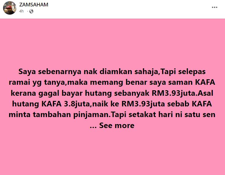 “Asalnya hutang RM3.8 juta, namun naik sebab Kafa minta tambahan pinjaman. Tetapi setakat hari ini satu sen pun belum pulang ke saya,” katanya dalam Facebook.