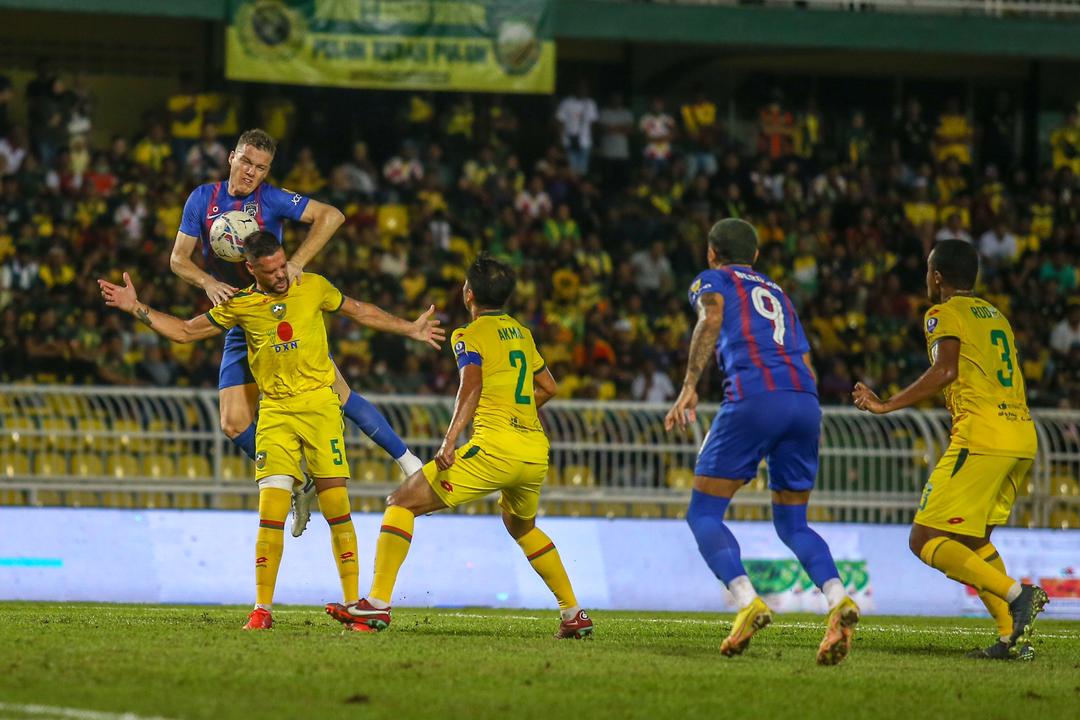 PERTAHANAN JDT, Shane Lowry melompat tinggi ketika cuba merebut bola daripada pemain Kedah dalam aksi Liga Super di Stadium Darul Aman, Alor Setar. – UTUSAN/SHAHIR NOORDIN