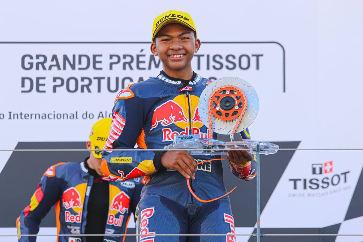 Pelumba remaja berusia 16 tahun itu melengkapkan aksinya di kedudukan ketiga dalam perlumbaan kedua Red Bull MotoGP Rookies Cup pada Grand Prix Portugal, Mac lalu.
