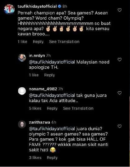 Taufik yang memenangi pingat emas dalam Sukan Olimpik Athens 2004 dan Kejohanan Dunia 2005 kemudian membalas di Twitter mempersoalkan sama ada Chong Wei memenangi Sukan SEA, Kejohanan Dunia atau Olimpik.