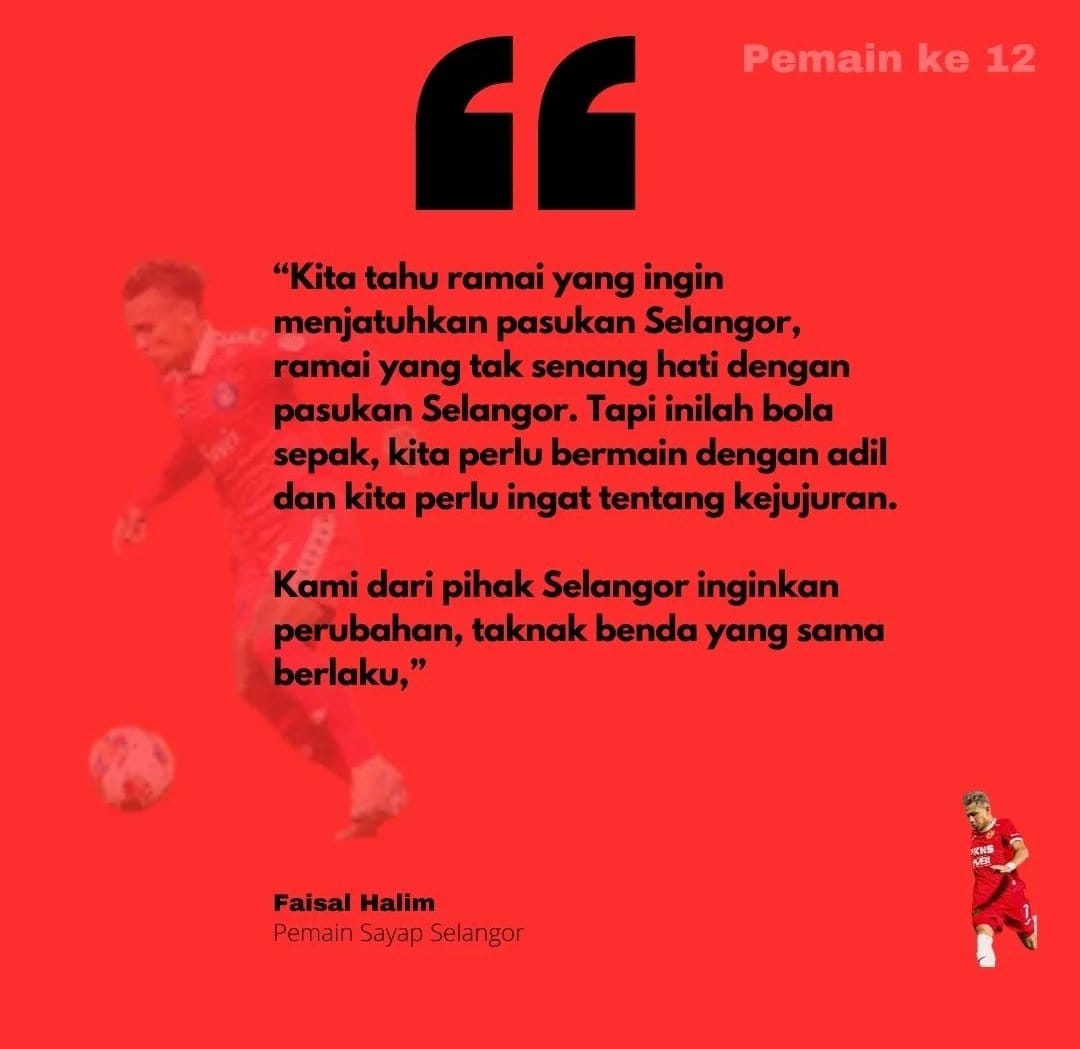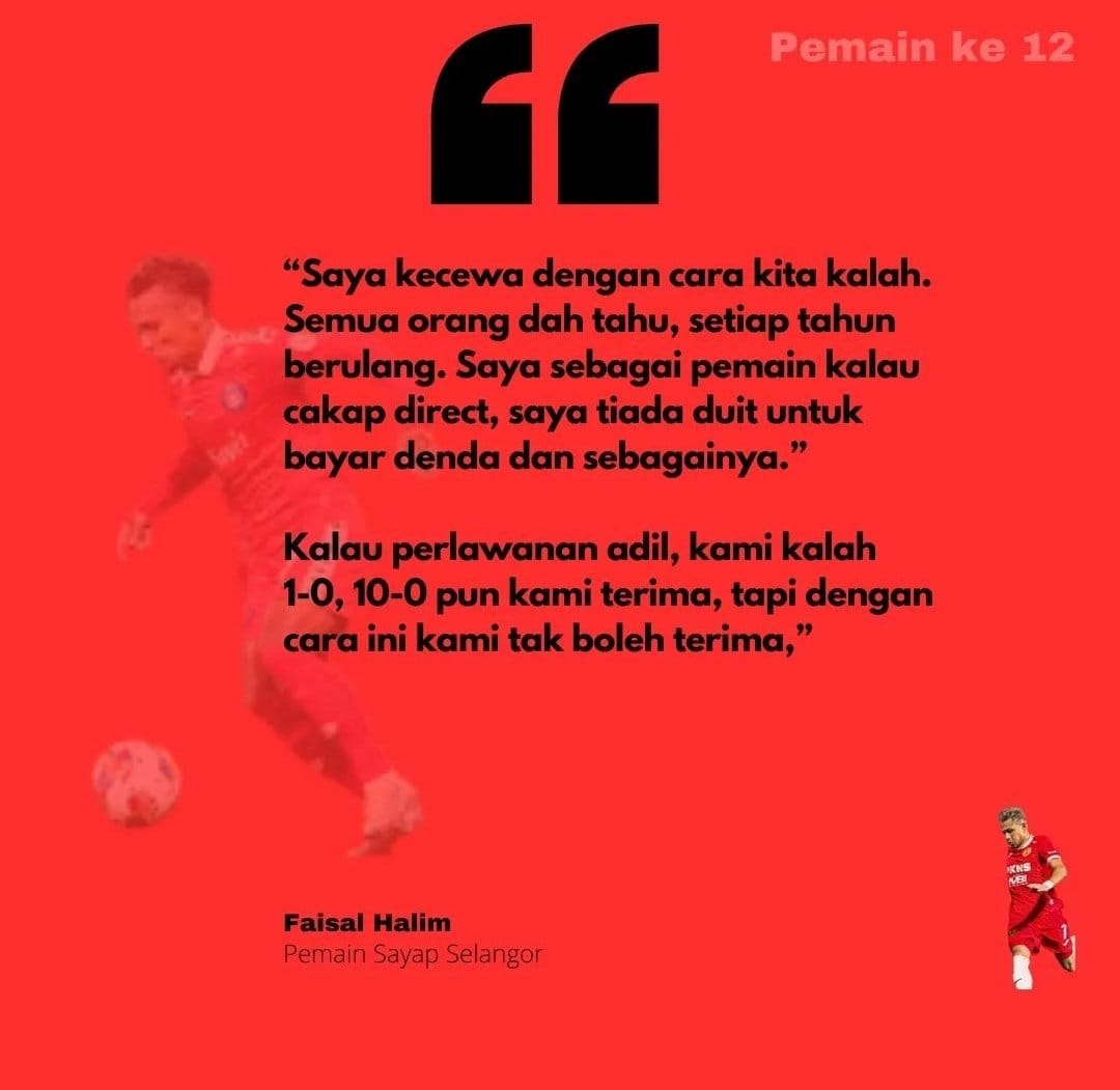 “Berat sangatkah kesalahan yang dilakukan Faisal sehingga dia perlu menerima akibat digantung semalam empat bulan. Hukuman ini dilihat seperti mahu membunuh karier bola sepak pemain itu.