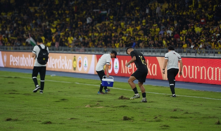 Terdahulu pada aksi final Pestabola Merdeka 2023, Selasa lalu, padang Stadium Nasional hanya bertahan 30 saat sebelum rumputnya tercabut meskipun kelihatan cantik dari jauh.