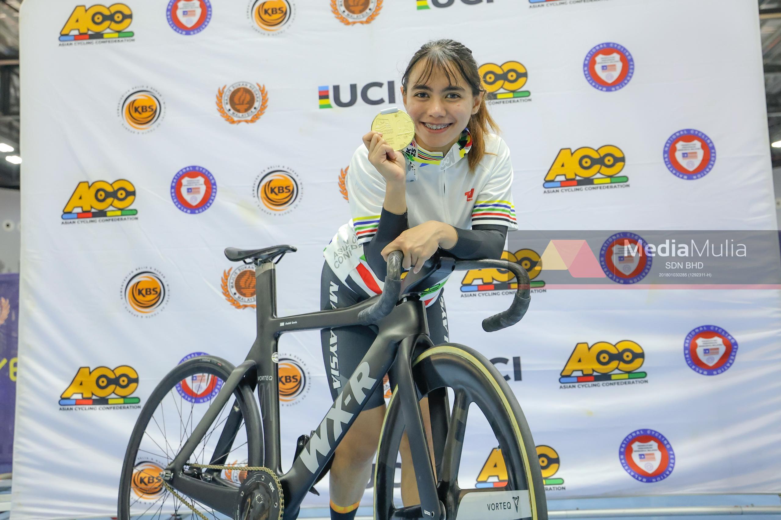 NILAI: Atlet basikal trek negara, Nurul Izzah Izzati Mohd Asri, berjaya mempertahankan pingat emas dalam acara Keirin pada Kejohanan Basikal Trek Antarabangsa yang berlangsung di Velodrom Nasional, Nilai, hari ini.