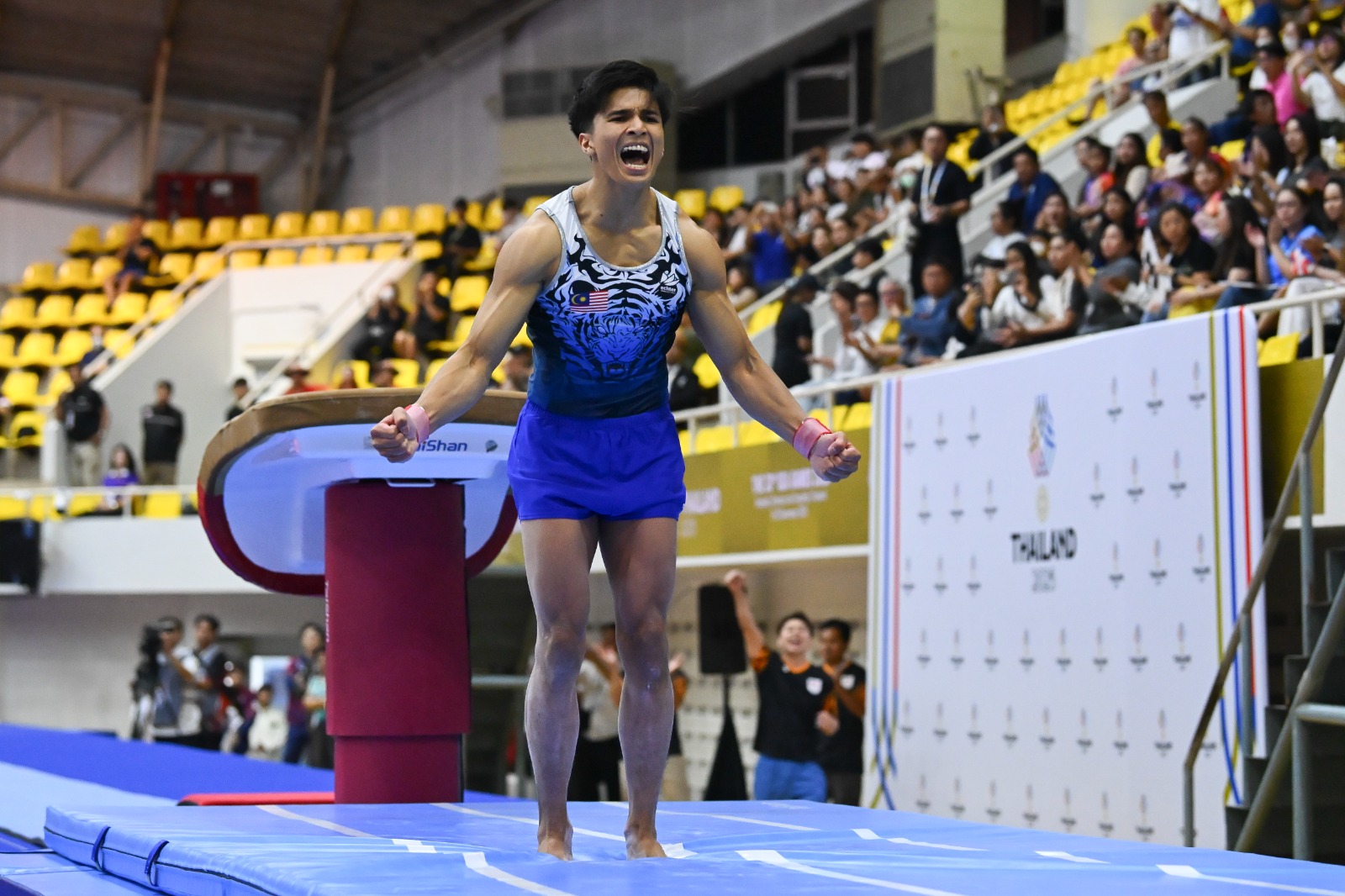 Dalam aksi di Gimnasium 5 Thammasat University itu, jaguh gimnastik artistik lelaki, Muhammad Sharul Aimy mempamerkan aksi memukau untuk meraih pingat emas dalam dengan catatan 13.833 mata.