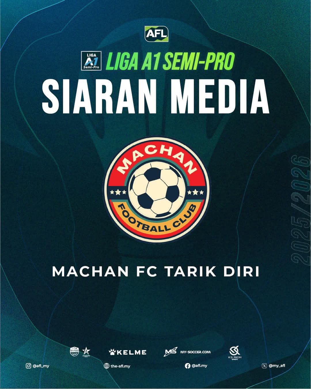 “Machan FC telah secara rasmi menarik diri dari saingan Liga A1 Semi-Pro 2025/2026 menerusi surat yang dihantar kepada AFL pada 3 April 2026.