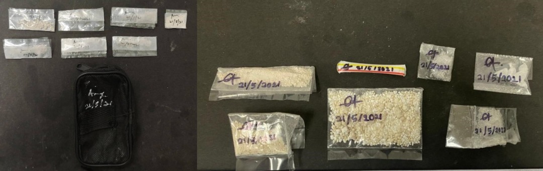 “Polis turut menemukan tiga peket plastik pelbagai saiz berisi ketulan jernih disyaki dadah berbahaya jenis syabu seberat 1.30 gram.