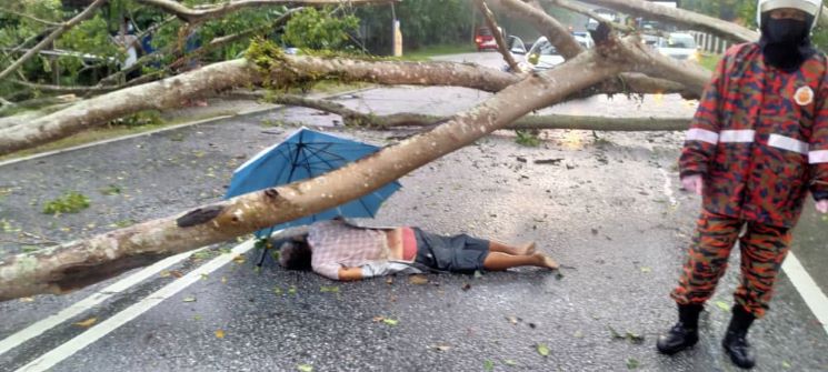 Katanya, setibanya anggota di lokasi, didapati sebatang pokok telah tumbang secara melintang dengan mangsa terbaring di atas jalan.