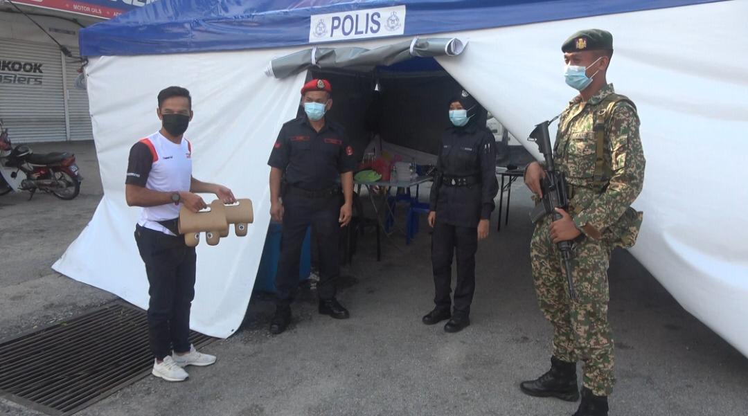 KUALA TERENGGANU: Bagi menghargai jasa barisan hadapan, jaguh Terengganu Cycling Team (TSG), Mohd. Zamri Salleh mengagihkan kopi kepada mereka yang bertugas di sekatan jalan raya (SJR), semalam.